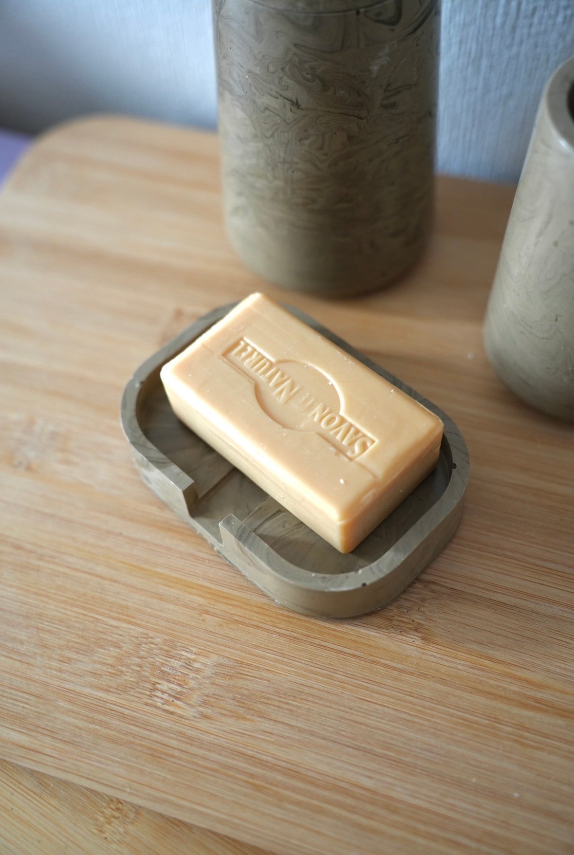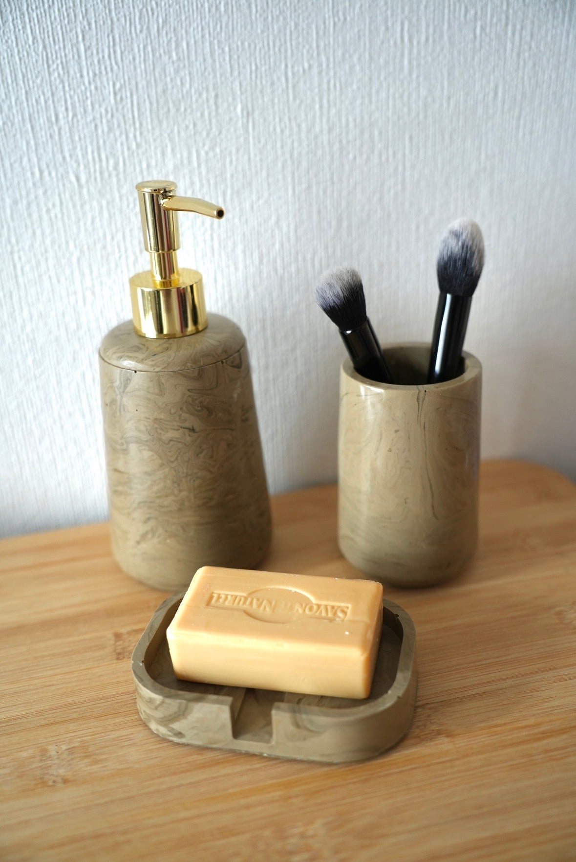 Ensemble de salle de bain en jesmonite, composé d’un distributeur de savon liquide, d’un porte-savon pour savon solide et d’un porte brosse à dents ou pinceaux.