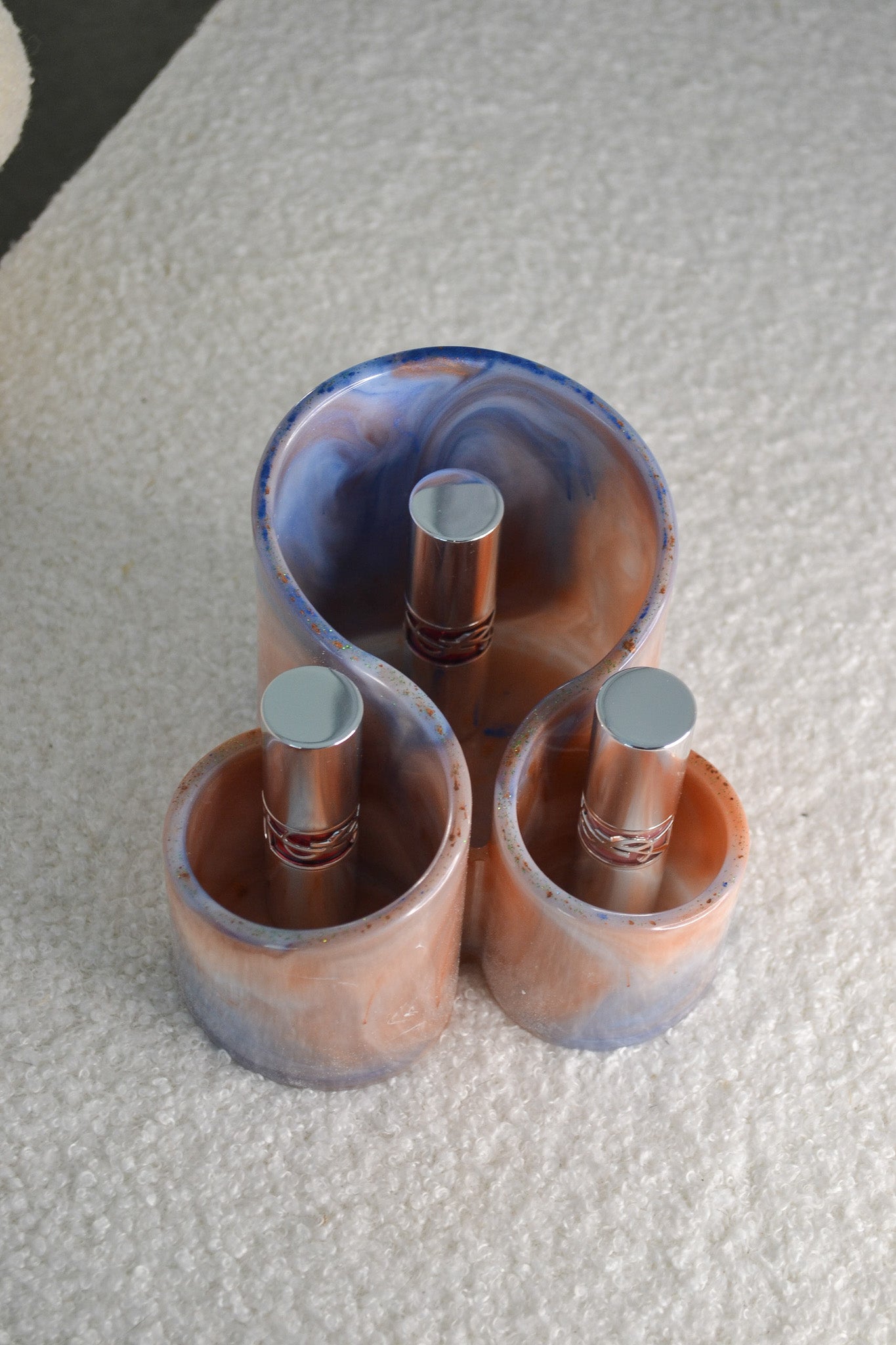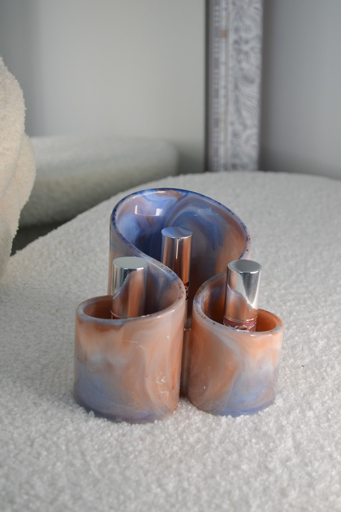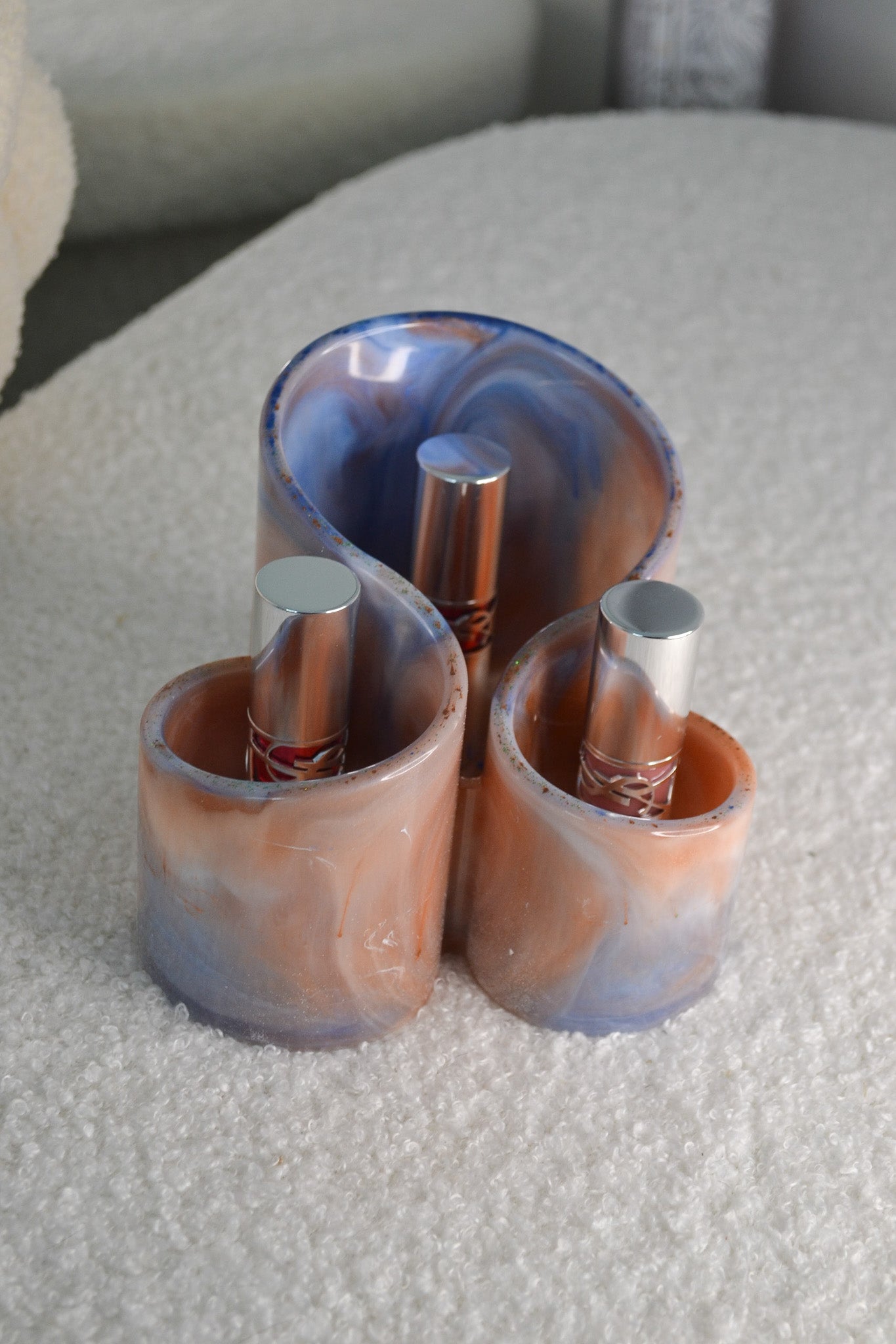 Cet élégant organisateur combine des nuances de bleu, blanc et marron, créant un effet visuel à la fois moderne et sophistiqué. Avec ses trois compartiments spacieux, Célia est conçu pour garder votre maquillage, vos bijoux ou fournitures de bureau parfaitement organisés tout en ajoutant une note d’élégance à votre décor.