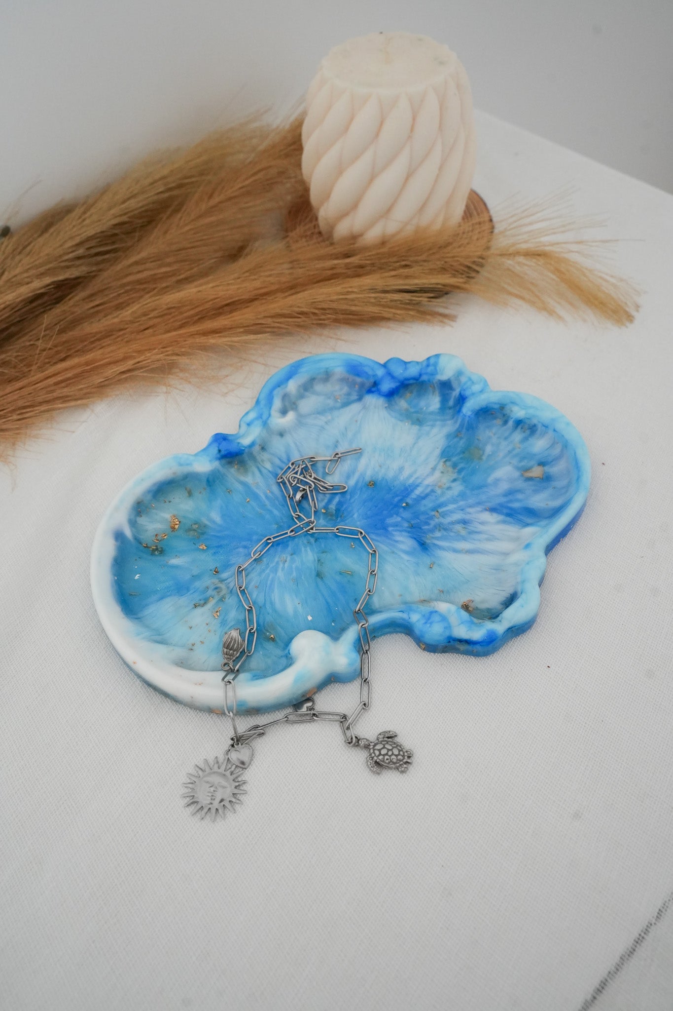 Offrez à votre espace une touche royale avec le vide-poche, une pièce d'exception en résine marbrée bleu et blanc, enrichie de feuilles dorées délicatement incrustées. Que ce soit pour votre entrée, votre bureau ou une étagère, le vide-poche transforme l’ordinaire en extraordinaire avec une touche de magnificence.