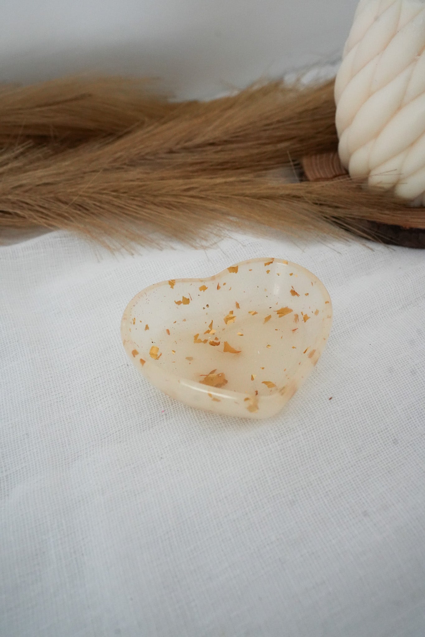 Ce petit vide-poche en forme de cœur, réalisé en résine avec un élégant beige et ses feuilles d'or chromés, est à la fois pratique et décoratif. Fait main avec attention, il offre un espace parfait pour garder vos petits objets bien organisés tout en ajoutant une touche de douceur et de couleur à votre intérieur. Son design unique et artisanal en fait un accessoire charmant qui illuminera n'importe quel espace.